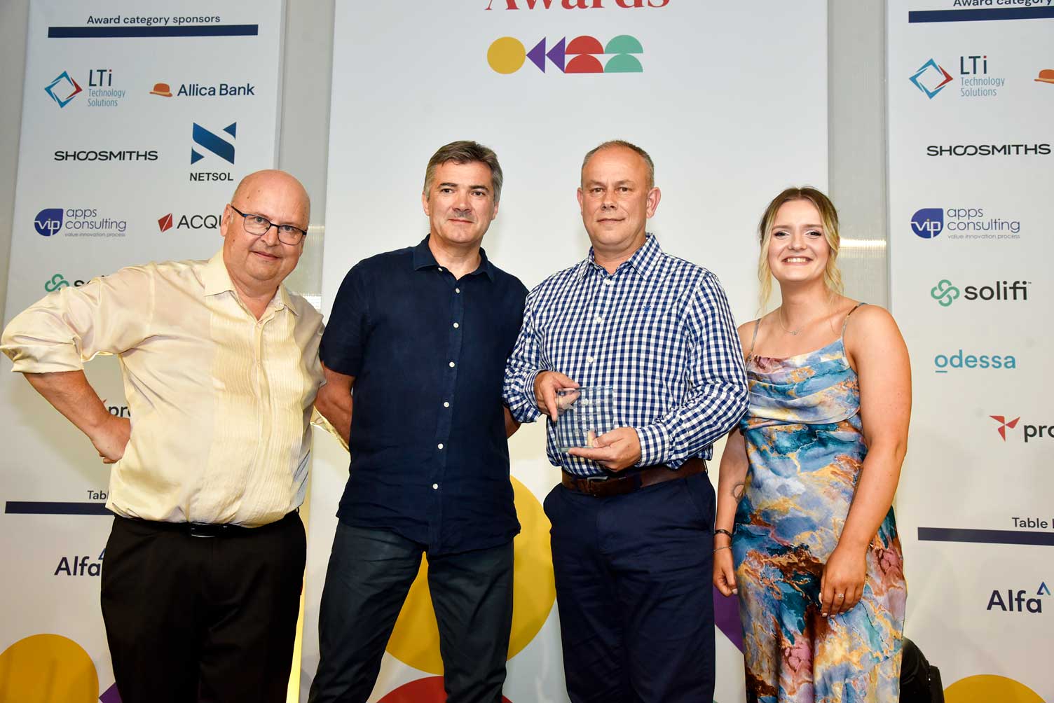 Picture shows (From left to right): Edward Peck, CEO of Asset Finance Connect; Kieron O’Toole, Head of Services Delivery, Europe at Solifi (award sponsor); Anthony Jones, Key Accounts Director at Asset Alliance Group; and Chloe Akerman, PR & Communications Manager at Solifi.